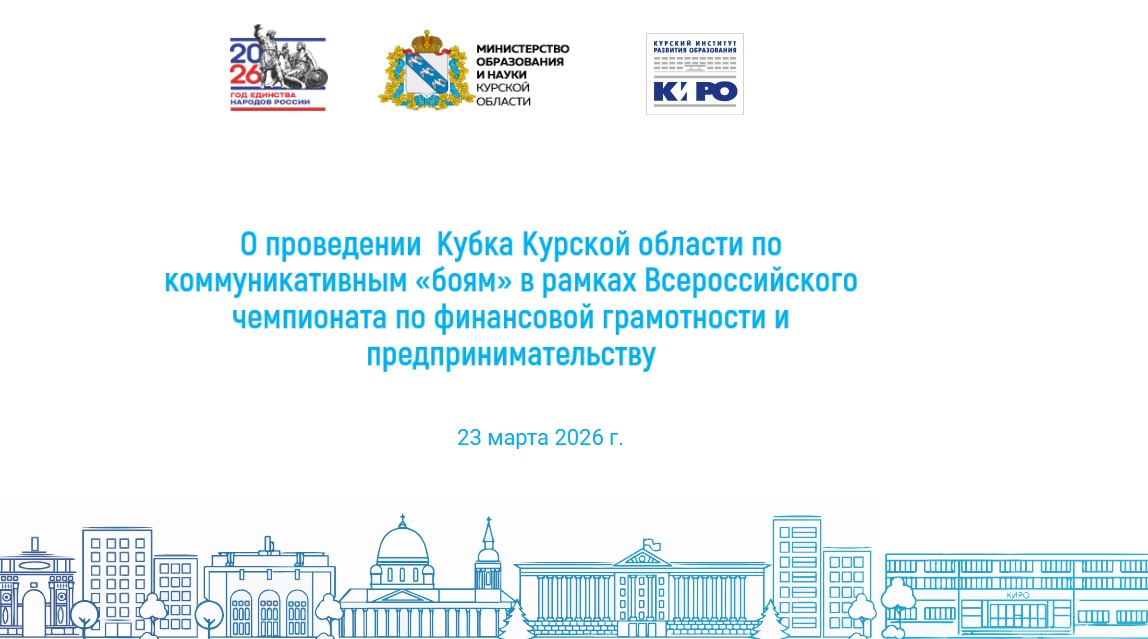 В рамках реализации Стратегии повышения финансовой грамотности и формирования финансовой культуры в Российской Федерации до 2030 года, утвержденной распоряжением Правительства Российской Федерации от 24 октября 2023 г. № 2958-рс, в соответствии с региональной программой Курской области «Повышение финансовой грамотности и формирование финансовой культуры населения Курской области» на 2024-2030 годы, утвержденной постановлением Правительства Курской области от 28 декабря 2023 № 1447-пп (с изменениями и дополнениями) 23 марта 2026 года состоялся методический семинар: «Организационные и методические вопросы участия команд в Кубке Курской области по коммуникативным «боям» в рамках Всероссийского чемпионата по финансовой грамотности и предпринимательству».