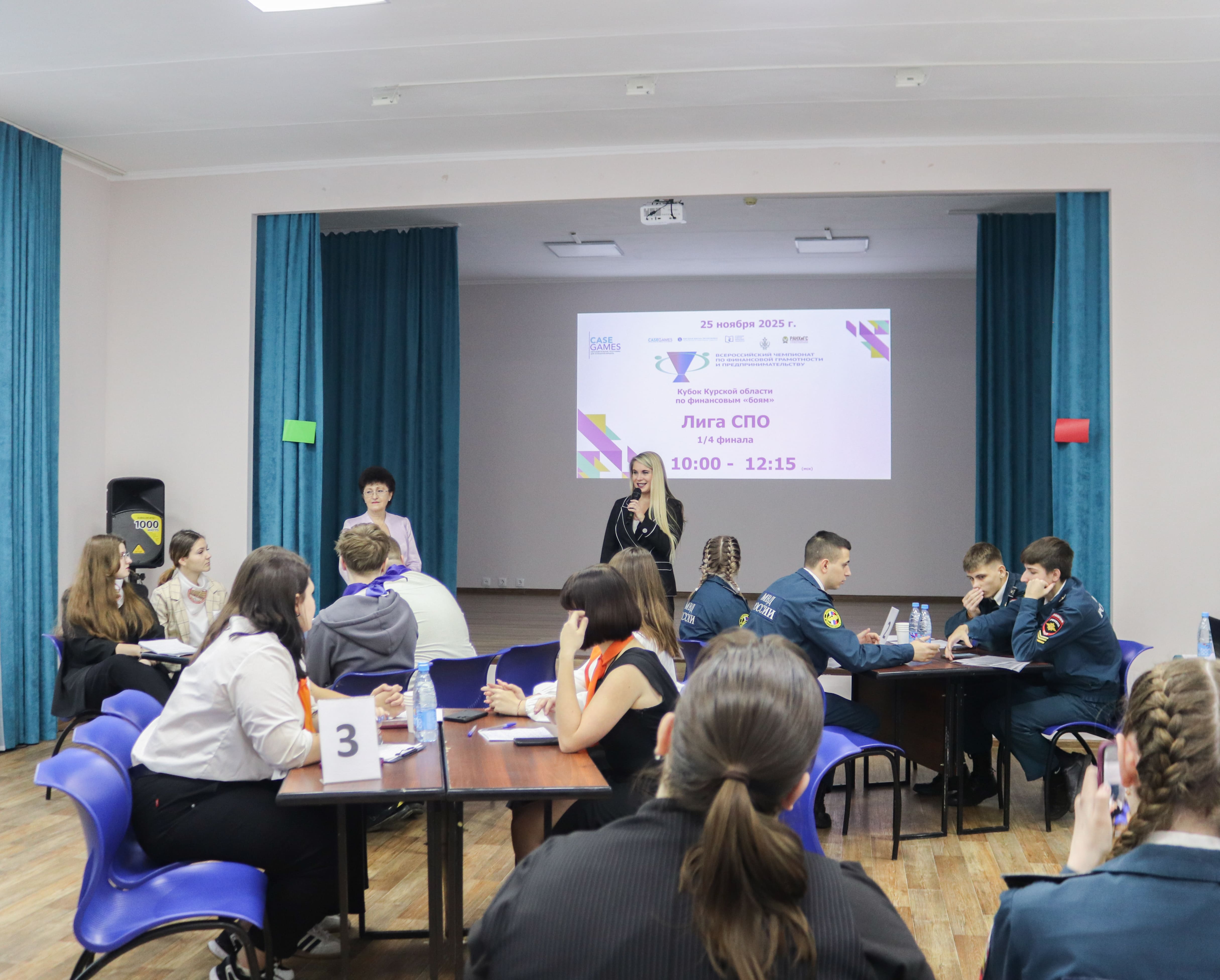 В соответствии с приказом Министерства образования и науки Курской области № 1-1109 от 22.10.2025 и графиком проведения Кубка Курской области по финансовым «бом» в рамках Всероссийского чемпионата по финансовой грамотности и предпринимательству 25 ноября 2025 года в актовом зале Курского филиала Финансового университета при Правительстве Российской Федерации были проведены турниры второго четвертьфинала в лиге СПО.
