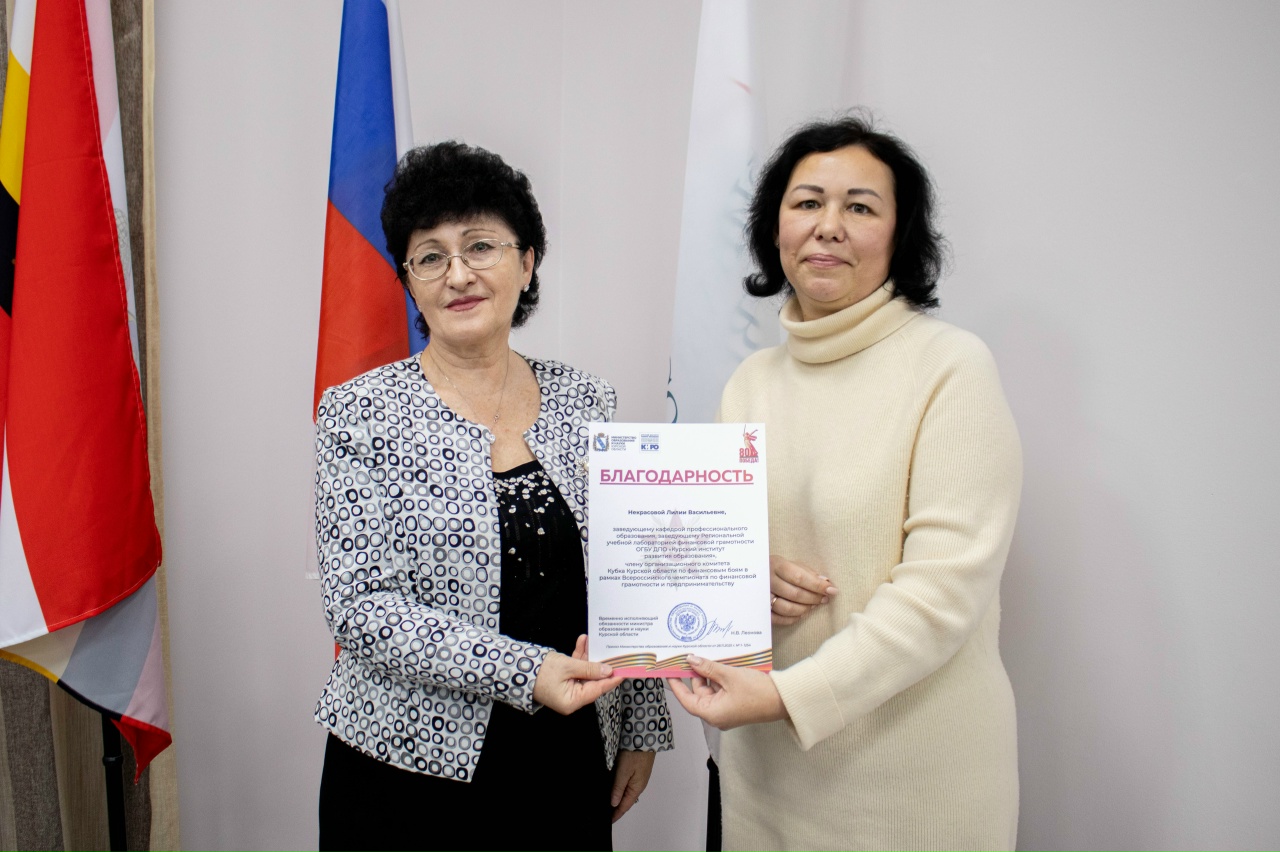 Благодарственными письмами Министерства образования и науки Курской области, а также дипломами педагогов-тренеров от Дирекции Всероссийского чемпионата по финансовой грамотности и предпринимательству были награждены преподаватели, подготовившие команды победителей и призеров Кубка по финансовым боям.